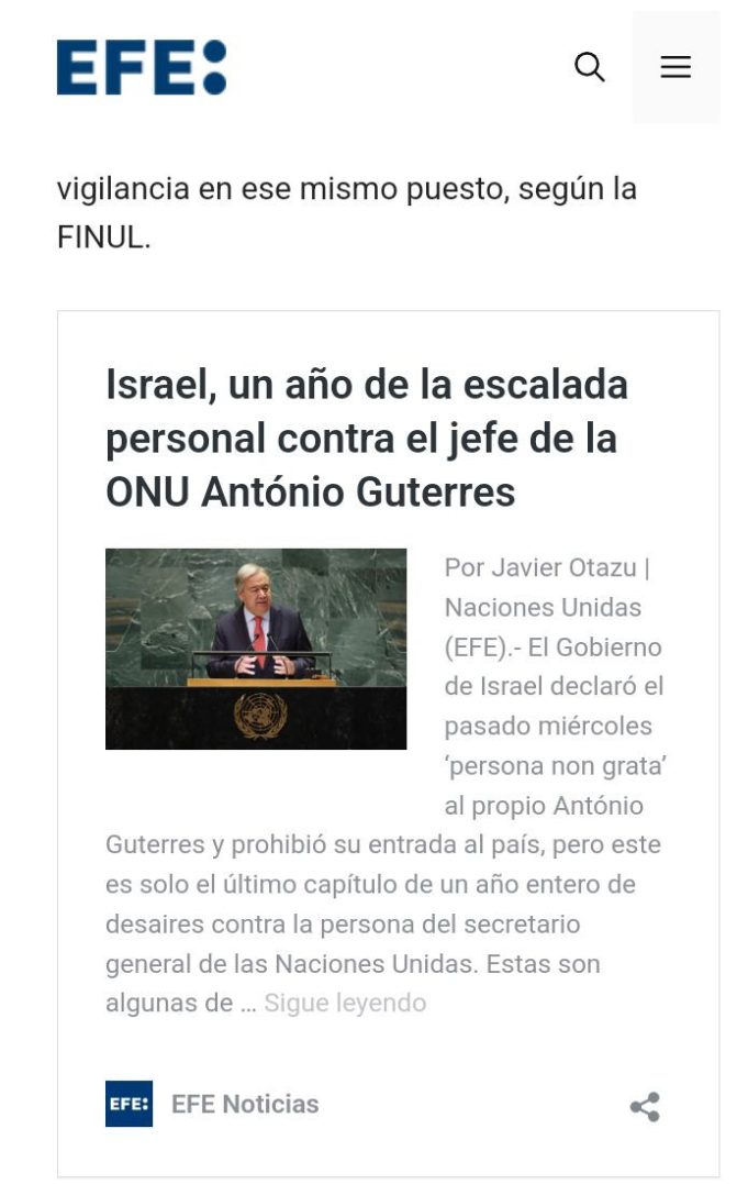 DIARIO EL MATERO, Beirut/Vientián (EFE). – El secretario general de las Naciones Unidas, António Guterres, afirmó hoy que el ataque de Israel del jueves a la misión de la ONU (FPNUL) en el sur del Líbano, que hirió a dos cascos azules indonesios, fue “una violación del derecho internacional humanitario”.