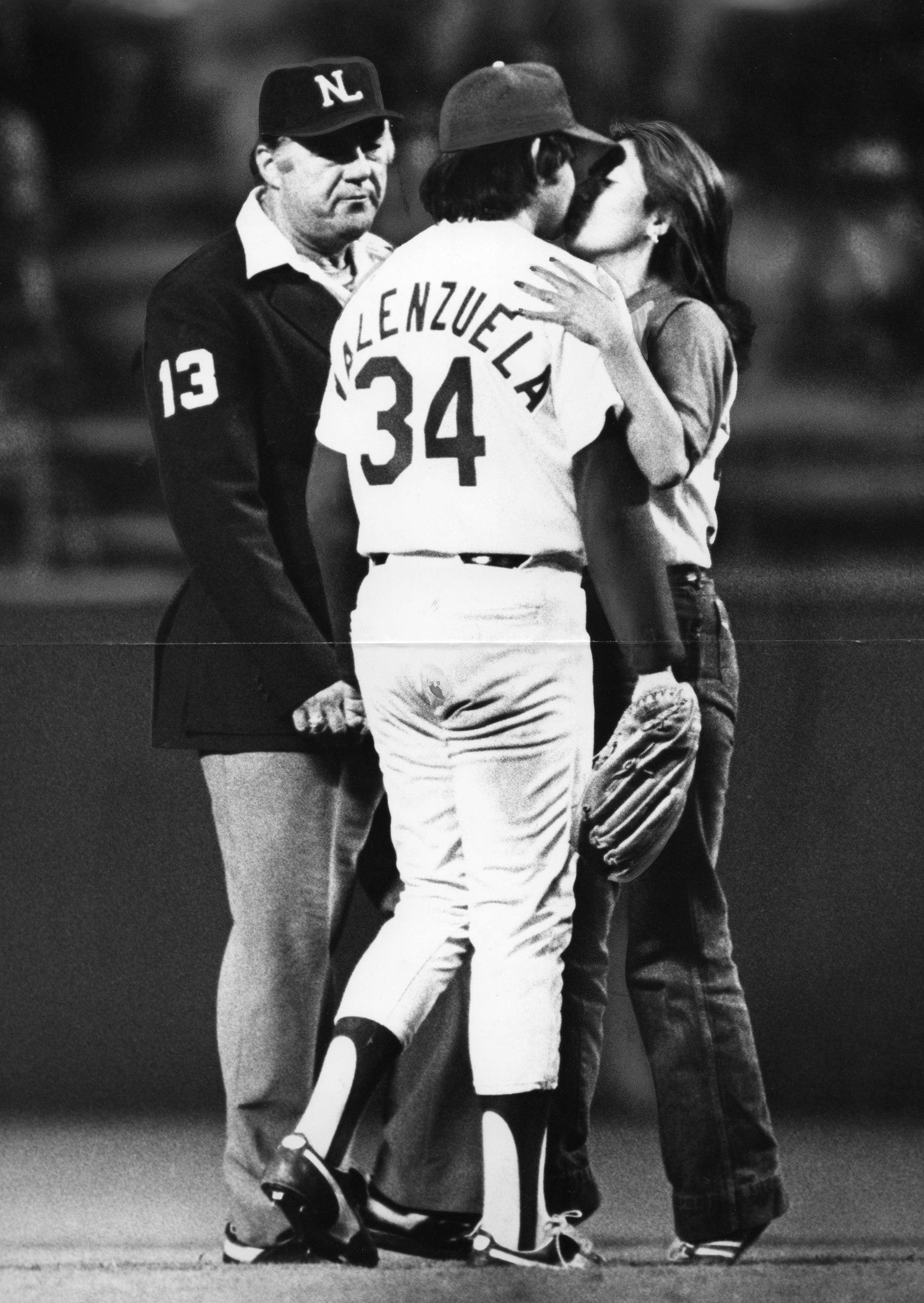 Un aficionado de los Dodgers entró al campo y besó a Fernando Valenzuela (Jayne Kamin-Oncea/Los Angeles Times)